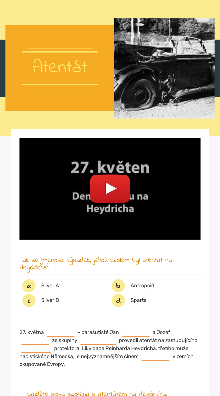 Více si naopak připlatí lidé s auty vyrobenými před rokem 2014, soukromé autobusy nebo velká nákladní auta. Ogabčík vběhl před vůz a pokusil se vystřelit, ale samopal se zasekl. Útok na reinharda heydricha s krycím názvom operácia antropoid bol vykonaný 27. Kde byli parasutiste v prevleceni za metare ulic. Atentát na heydricha středa 27.